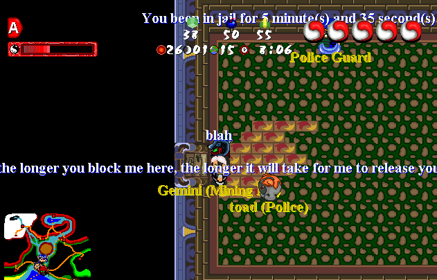 [list=1][*]You started attacking me with no tag on. I asked you to stop.[*]You continued attacking me. I threatened you with blacklisting you from Zormite. (Not that great an idea, but hey, I'm sick, and so I'm grumpy. you pissed me off.)[*]You still continued. So, I put my Police tag on and threatened you by saying that if you continued, I would jail you.[*]Scorpz hit me once, I gave warned him a warning that if he continued, I would actually jail him.[*]You can Scorpz continued hitting me with bushes, insulting me, calling me corrupt, and generally being rude, until I warped to the Police Station, and jailed you two.[*]I then proceeded to tell you why you had been jailed, like I do for everyone I jail, and went to visit you two in the no-pm jail in case you had further questions.[*]You then proceeded to block the door and continue to be rude to me.[*]You continued, and so I warned you with a longer sentence. I then proceeded to warp out of the jail seeing as you did not move.[/list=1]