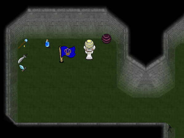 You fight each other in the dungeon by grabbing items to fight with. There's stuff like swords, heavy rods, and also lightning and bullet walls that you can pick up and carry. Once you throw them they start doing their thing for 30 seconds or so and then they disappear. Once you pick up a weapon, it's automatically equipped, and you can't store weapons. If you pick up a new weapon, you have to find the one you had before lying around somewhere to be able to use it again. Of course, you can't use your own weapons.