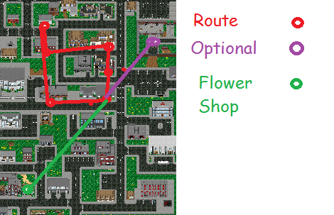Start @ Hospital. Head to Snow Resort, collect Sunflowers in front. Move to the block north w/ darkness66's NR house, collect Sunflowers in front.