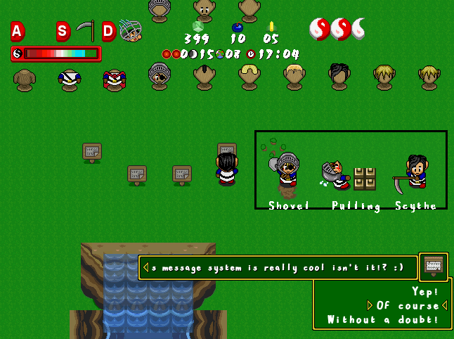 - New sign/message system with the addition of having multiple choice answers. You scroll the message with the left and right arrow keys and select an answer with the up and down arrow keys. The color of the message background is based on what type of message it might be. (blue for NPC, green for SIGN, etc) Also, the image of the sign you're reading is displayed, or if you're talking to an NPC, the head is displayed with a talking animation.
