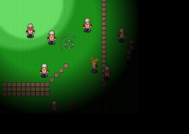 > Baddies(zombies) in large amounts that function on very simple script at their current AI. They simply limp towards the player, and don't look for them. However it would have been easy to implement more advanced looking and such... but the limping movement was what I initially had in mind and focused on. By the by, they all limp at different speeds and pauses, so each one moves uniquely(and randomly). They only face one directly, because I'm no gani maker and I had more important things to focus on(I just needed one direction to limp to see what it looked like with the movement).