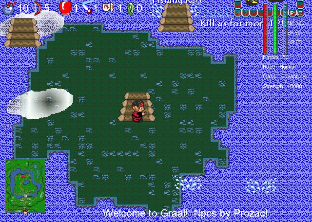 I am starting a server project. I do not have a name yet but I am open for ideas. I have prozac helping with whatever scripts we need. Here are some of the things we already have. Weather system. Fishing on a raft. Flame bow. And we are scripting a new fighting system as well. I will post a screen of the npc level with those that prozac made. I am hiring LAT/NAT/GFX. Please, if you are interested forum pm me or post your aim. Here is a screenie of the raft. no gfx for rod u cant see.