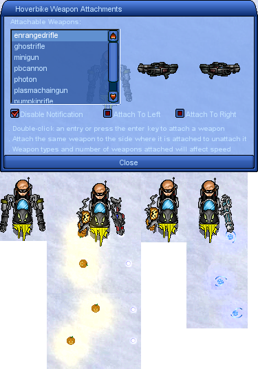With superbikes, hoverbikes will now gain the ability to attach up to two weapons to them. When you enter a hoverbike you will be prompted with a notification on how to access the weapon attachment GUI, of which you can disable the notification from the GUI itself (as seen in the screenshot attached). From the weapon attachment GUI, there is a list of weapons that you can attach listed alphabetically, and you have customization to the point where you can choose to attach different weapons on each side of the bike (so you can have like a ghost rifle on the left side and a pumpkin rifle on the right). You can also unattach any weapons currently attached and you can move around with only one weapon attached if you would like. You fire the weapon(s) by pressing or holding the 'd' key.