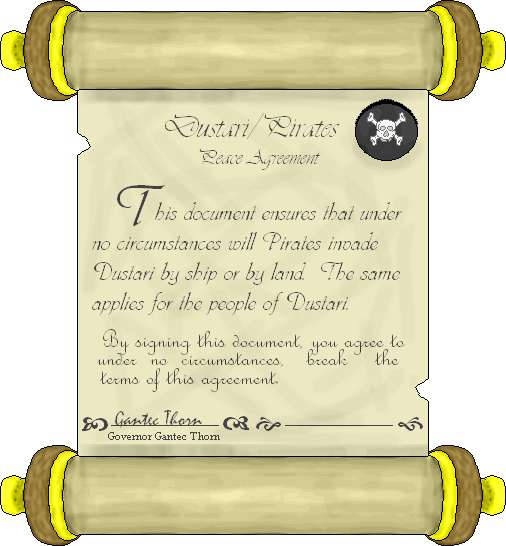 I propose a peace agreement for Pirates and Dustari. This is not an alliance, for this is a peace agreement.