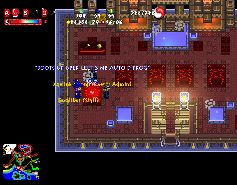 This is not a very good version of Graal2001, though, and if this is the only version available that would probably make me sad. This version you have here is missing A TON of work that had been done (mt antora is still blank snow, lame-ass desert in the southeast, etc.). I just examined this overworld and it is not looking too good compared to what had been done with it (especially with the levels) after quite a bit of work by lance's team. The latest version of Graal2001, the one which was directly competing with Bomy Island, is the version which I am looking for. The only other version of Graal2001 which interests me would be a very ancient and basic original slate version.