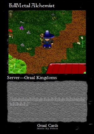 The program is call CCG MAKER. I will Edit This and Put in a Link in a Bit. I actually might start making a section on the main graal server forum for players to submit screenshots and then I put them on cards, I will choose 5 people each week! But this is only if I am loud, some of my Friends gave me their scrren shots/and some strangers...