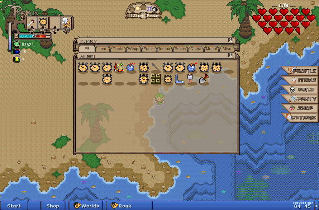 Our overworld was created so we could add new aspects to graal. One of our new ideas is the ability to obtain wings and fly. This overworld has a horizon, floating islands, and outterspace. There will be flight time, and cooldown time to aviod laming in pk areas. The overworld on Roak is very active and different then most servers, such as day/night, weather, days of the week, a sun that rises and sets according to server time (it will move from west to east across the gmap horizon). Also we dont have houses all over the gmap like you see on other servers. We have actual coasts, forests, highlands, deserts and so on. The gmap is about 32X32 its massive. We dont have any warp rings but we have warp portals that will warp you to specific areas at a cost. There will be towns/ports with ships that sail from town to town and we are hoping for future personal boats (future details will be release later).