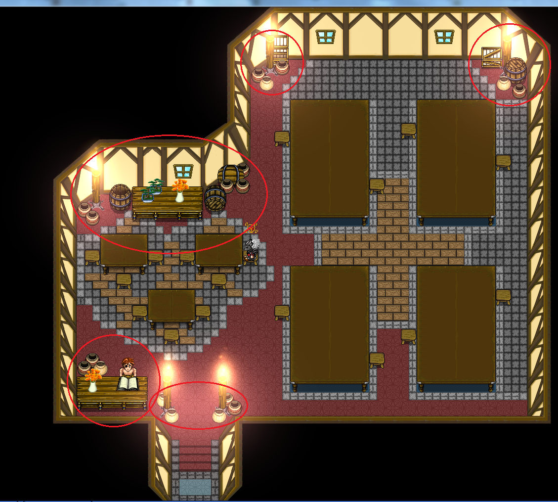 Then the symmetry of the trade/gamble tables and surrounding chairs contrasting with the complete shitstorm of barrels and pots around the walls is just very unpleasing.