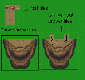 The pond doesnt want to run off the cliff, 'cause thats what everyone else does. There are 2-3 tile errors along the cliff, WHICH cant be fixed without images. (If you see some that can, just point 'em out for me please), but thats the best I could do. AND the dirt uses all 6 dirt tiles possible in the variety. If ya dont like it, show me a better way of doing it please? Or explain how I should do it.