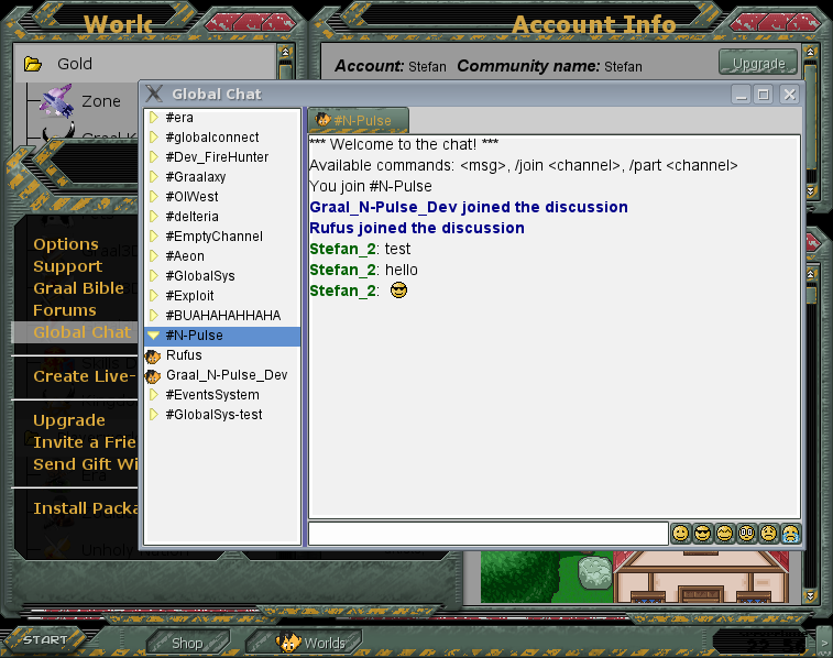 There is a new entry in the Graal start menu "Global Chat" which lets you use the Graal chat channels even with the client / scripted RC. I've also added some small stuff (green color for the chatter name, display when someone is joining).