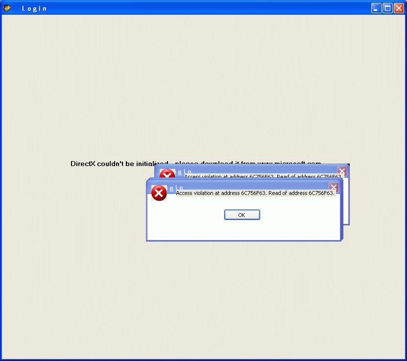 I had a Graal up, so I opened another one and I noticed that if you go fullscreen with anything, either Graal or any other game that goes fullscreen you get an error about DirectX. It says something like "DirectX could not be initialized, please download it from www.microsoft.com". There is also a window that popup that says "Access violation at address 6C756F63. Read of address 6C756F63". It never goes away.